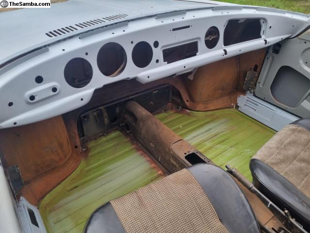 I never wanted to write this post but circumstances dictate I need to sell my 68 auto sunroof project. The car is with Martin Hobe at Revs Automotive in Holland. The floor pan halves have been replaced and front and rear rust repairs have been done, drivers side rocker is just tacked in place. Originally pine green with a white roof. Almost all, if not all parts are there. This is a rolling project with most of the welding complete. Revs have done an excellent job on the welding and all repair panels required to finish the car are there.