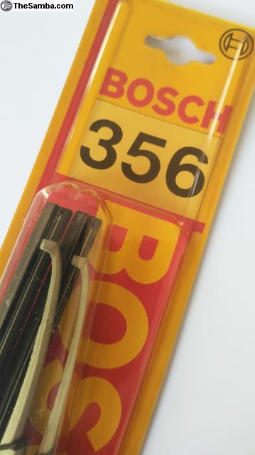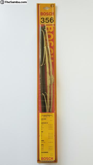 Original New Old Stock (NOS) set Bosch 400mm wiper blades for VW Type 4 / VW411 + VW412 models. The box is unopened and in almost mint condition. The plastic mounting clips are in the box (not visible on the images). Wiper blades and rubbers appear to be in good condition.