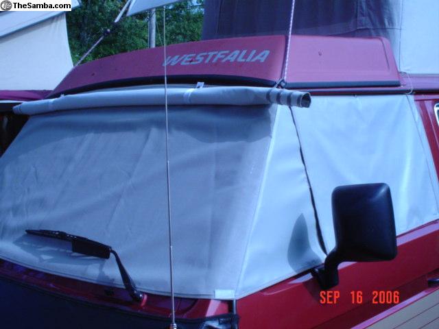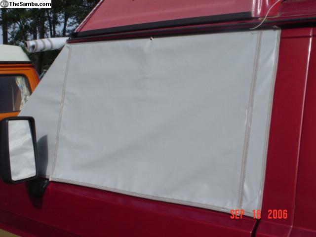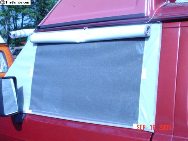 The Sun Shades are made of the 90% sunshade Exterior Quality Vinyl Coated Mesh. Sewn With Marine Poly Thread to Match. Bound or Edged in Exterior Marine Quality Binding made for the Boating Industry To withstand the Rigors of out door use. Easy to store by rolling or folding and hiding in the Van. Mine sits on top of the folded Upper Bunk. They fit all Year Vanagons from 1980 to 1991 including Trucks and Campers/Westys. Also available for 55 to 79 Buses and all Eurovans.