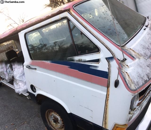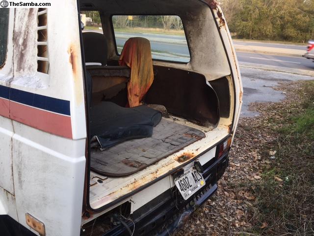 parting out 1980 VW Vanagon. no motor or transaxle. other parts that have already been taken are rear hatch, sliding door, rear bumper, front seats, front grill, etc. it does still have a good windshield, the middle and rear seats, and the body is in pretty good shape. no visible signs of wreck damage. message me for info on parts not visible in pics, or to get a price on any remaining parts. or take the whole vanagon for $350.00. tires will hold air for a while if need to load on trailer or tow.