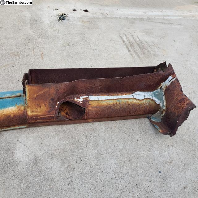 Here is a right side heater channel /rocker panel section parted from an early 1960s beetle. Solid repair metal cut as shown. $50.