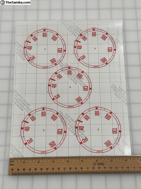 Here are some reproduction kilometer overlay stickers. These will need to be final cut by the buyer during install. Background is clear. Only the red image is visible as an overlay on the speedo face.
