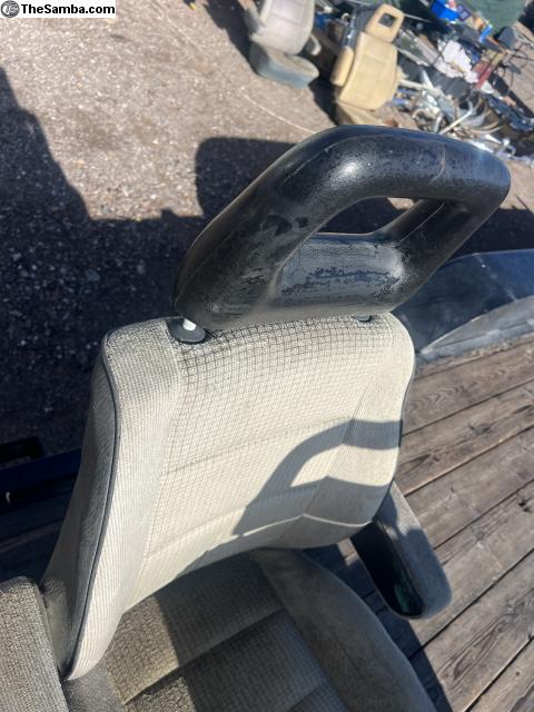 Volkswagen bus Vanagon Westfallia Syncro front seats. These are super comfortable. Great for a long journeys. Come with all four armrests. These are a rare colour combo of black vinyl blackhead rests with silver cloth Seats located in Las Vegas. These will fit all Vanagon buses made from 1979 to 1992, and they were also fit all leight bay windows From 1977 to 1979 with the same rails. If you want to fit these two Early bay windows, you can buy the rail secondhand online or remove the rails from a Vanagon at a junkyard.