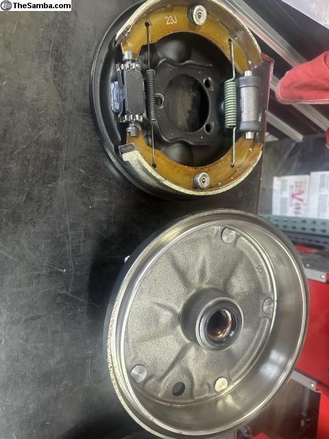 new front drums with 14mm pressed in studs, complete backing plate with new wheel cylinders, shoes, and complete with new wheel bearings and seals. asking 300.00 but will consider offers.