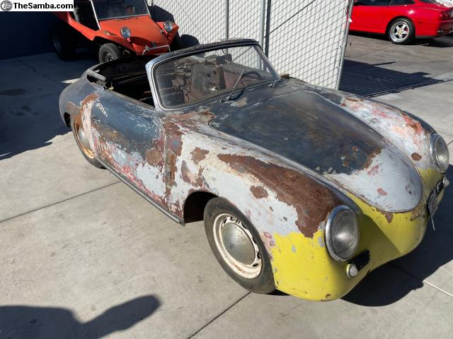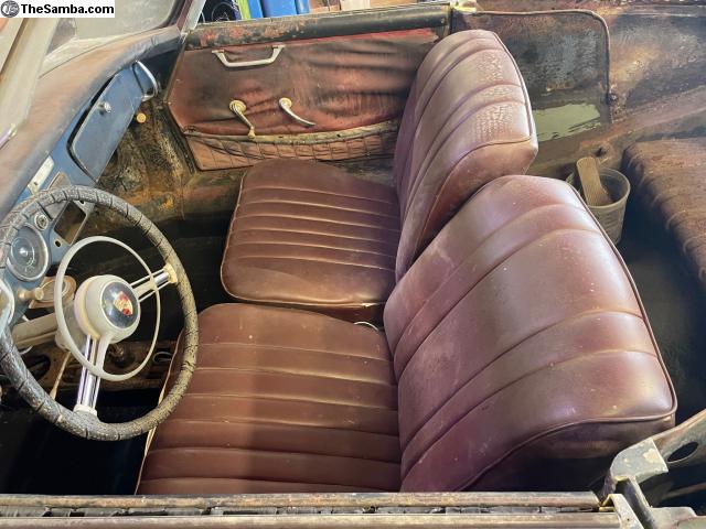 1956 356 Cabriolet Aqua Marine with Red interior, runs and drives with its original matching motor complete as shown on the Kardex. Floors have been restored with all new metal. You can clear it and enjoy it with all the patina or we can make it a show winner for you.