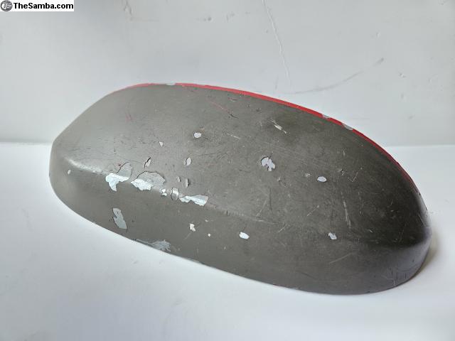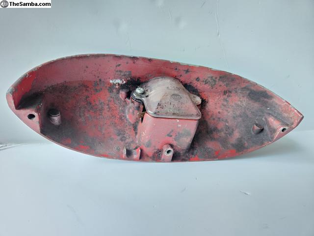 Rear engine lid license plate light housing for 1964-1967 VW Beetles. Housing has been repainted and original Ruby Red paint appears to be underneath. Good candidate to try and strip the repaint and use on an original paint car or strip it and restore it.