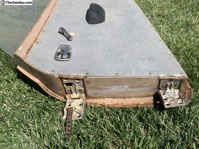 Karmann Ghia passenger side door, complete with glass and working roll up mechanism and good door hinges. It has body filler down low and a large soft dent in the middle, it's a dry door with no rot. It currently has an aluminum door panel pop riveted in place. I'm unsure of the year so please look at the pictures and make sure it's the right one for you.