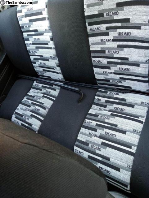 The Recaros in this car have been reupholstered. From the factory the seats would have said CARIBE GT where these say RECARO, but the pattern is the same.