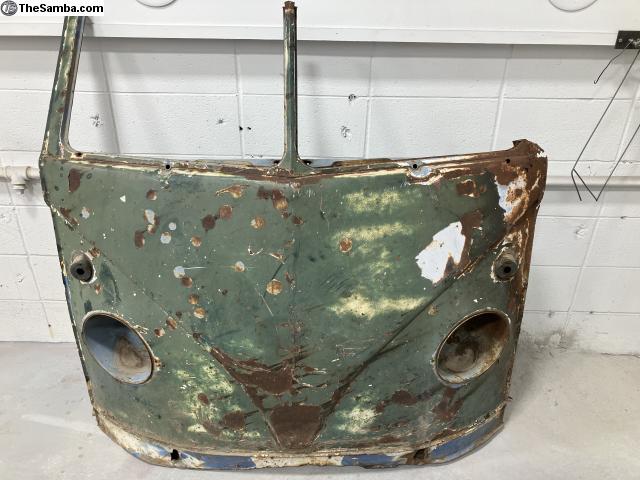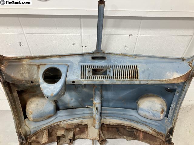 Nose clip with dash section from a 1955 single cab. Salvaged from a truck that was laying on its side in a pool of water, so the left upper door pillar/window frame is crusty.