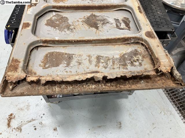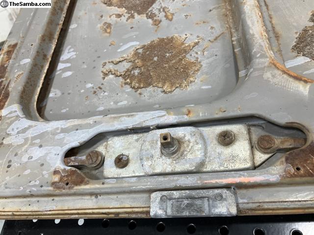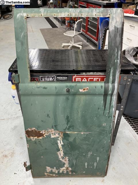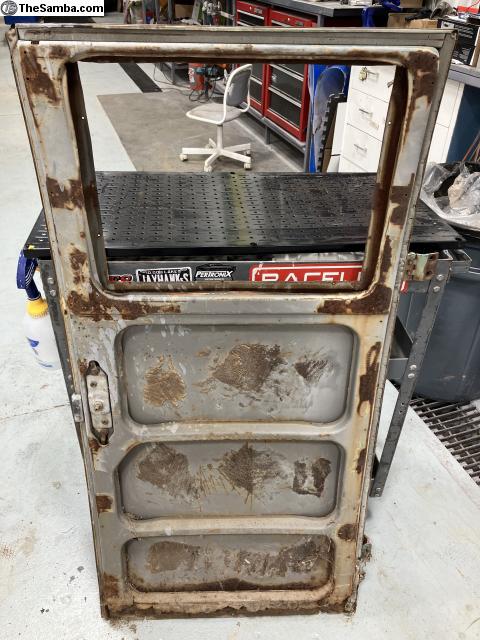 Rear cargo door with latch, catch, and hinges. Cut for camper window. Bottom four inches are rotten, but the original shape/size is preserved.