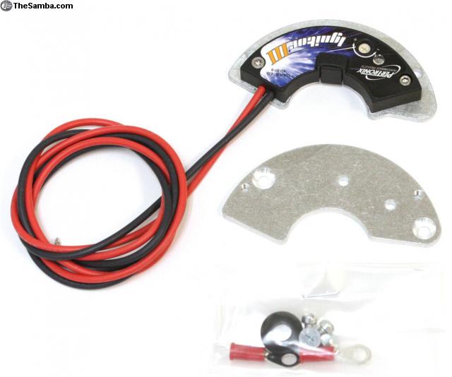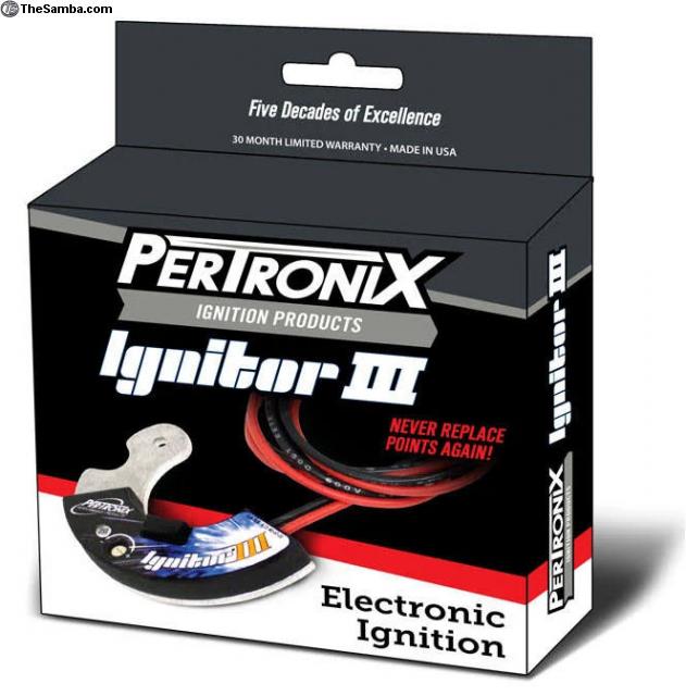 New Pertronix Ignitor 3 Points replacement with Rev control. This unit fits into any 009 or 050 VW Type Distributor. Adjustable Rev limiter, multi spark and start timing retard is built into this unit. Simply follow the instruction by conecting a 9 volt battery and then adjust RPM's by 1000 (Slow flash) and by 100 (short flash). Instructions included. You must use a Pertronix 44011 Black Coil (.32 ohm) or a 44001 Chrome Coil (.32 ohm) with these units.