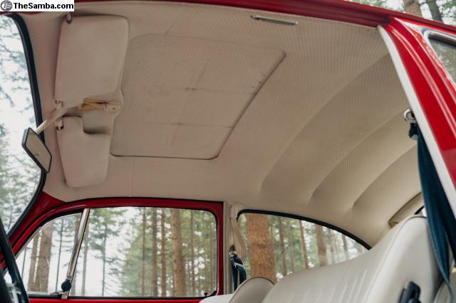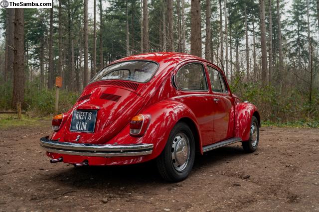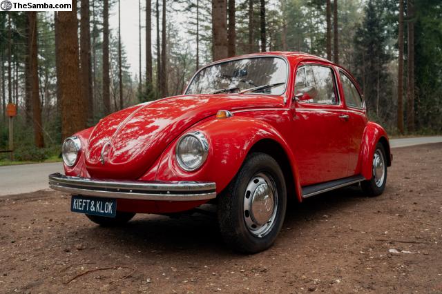 This Beetle was originally delivered in Germany and still comes with its German papers. The odometer shows just 5600 km, and the oil change records also indicate a mileage under 5000 km. It almost seems believable! The inner fenders are still in their original, stunning red color and have never been treated with undercoating. Inside, the car is like new, and on the outside, aside from a few minor scratches, it’s also in excellent condition. The right front fender has been repainted at some point, but other than that, this Beetle is in untouched, original condition.