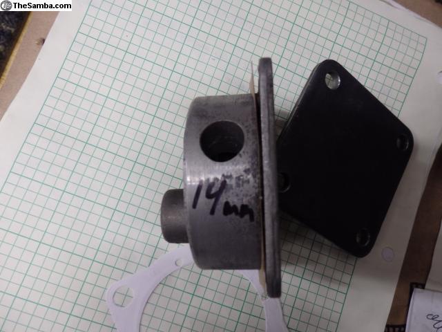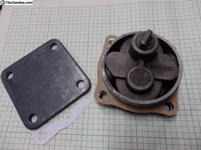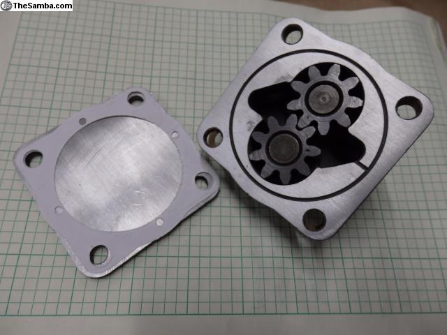 refurbished Shadek oil pump, 21mm, late flat cam, 14mm inlet, 12mm outlet. includes new gaskets and cover plate and a set of low profile cam screws with lock washers.