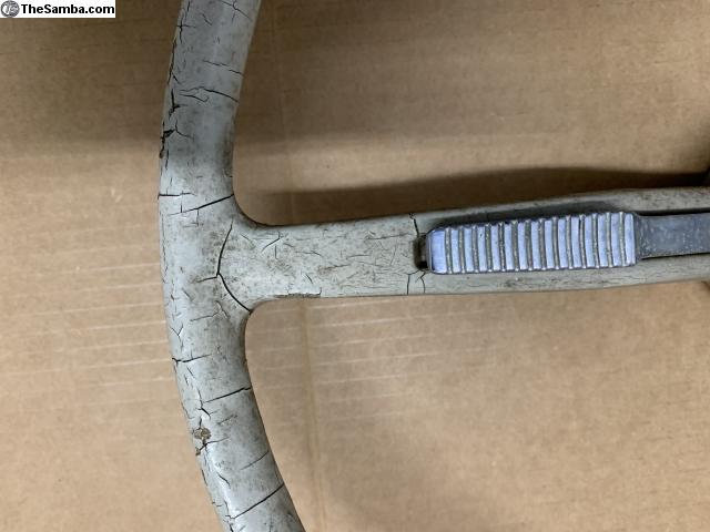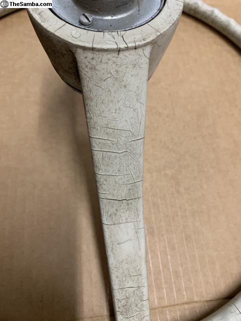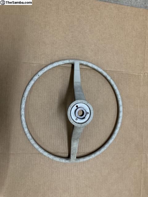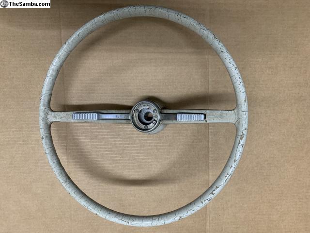 This steering wheel is from a 1964. It is basically complete and correct for 64 and 65 cars. It has cracks as shown in the pictures.