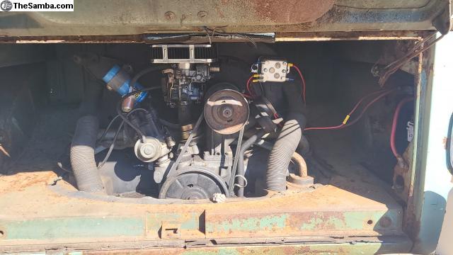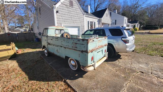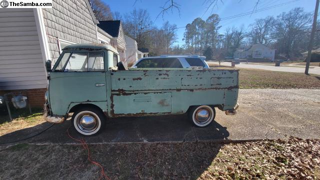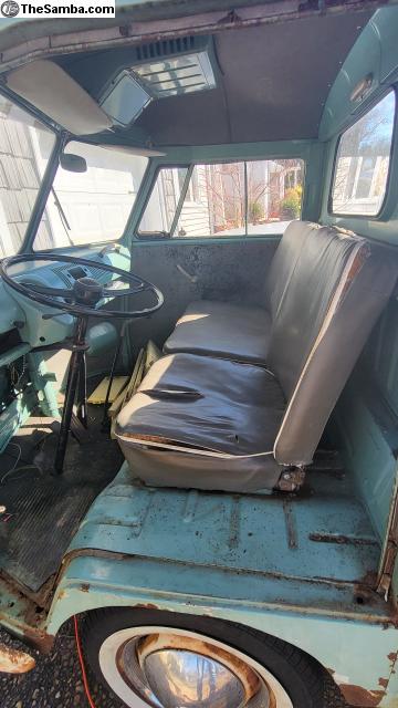 Mostly original paint 1963 Turkis Single Cab with dual treasure chests. Was used as a farm truck by Dalton chicken farm and have maintenance records for the first 21k miles. Bus is complete and running. Bus has rust and can show more pics of rusty areas on demand. Has original rubbers, so that contributed to rust issues. Rust in all the places you would think, floor both sides, dog leg, etc. Original upholstery and horsehair padding with original factory inspection sticker. Original speedo 24k miles showing, who knows how many times it's turned over. The good: