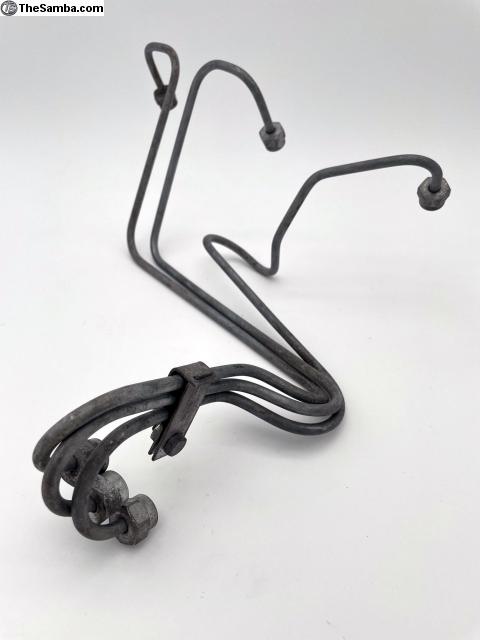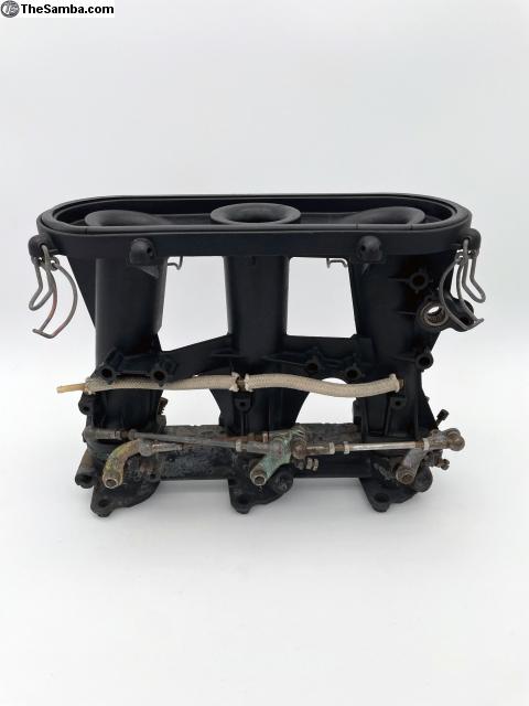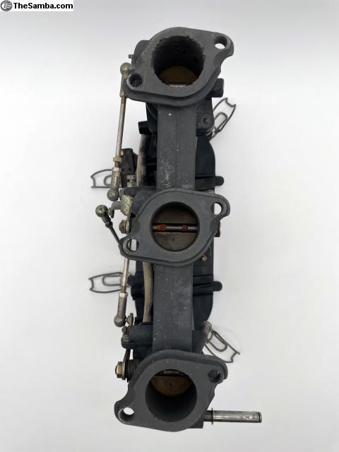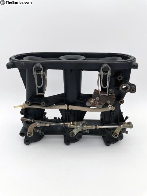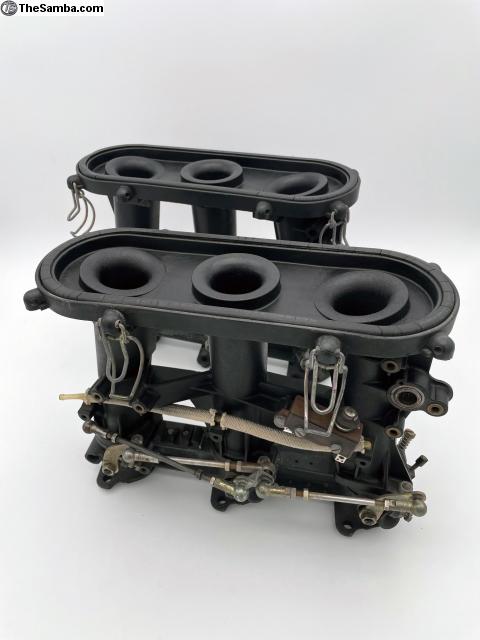 Porsche 911 "T" MFI throttle body / intake pipe assembly for '72-'73 US delivered cars. Comes with the crossbar shaft and both sets of injector lines. There is some corrosion on the passenger side throttle body but the driver's side appears to be in good shape.