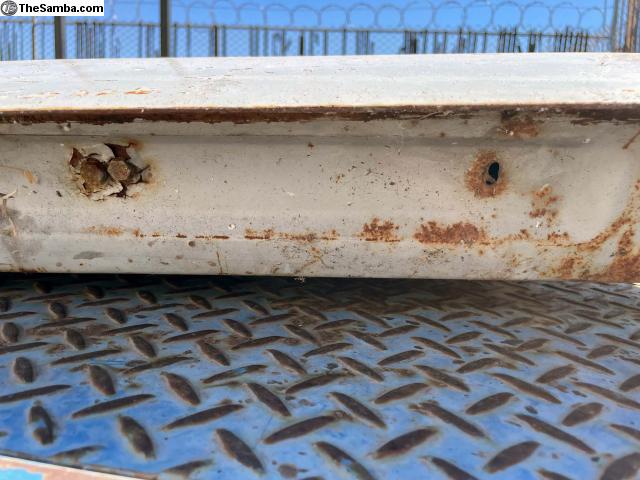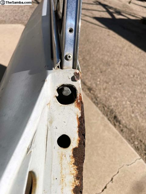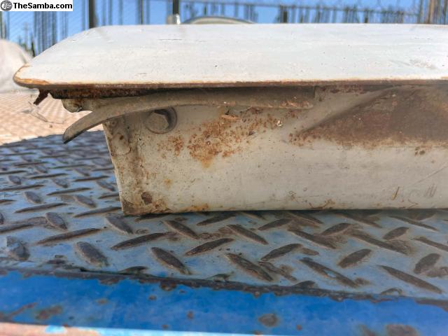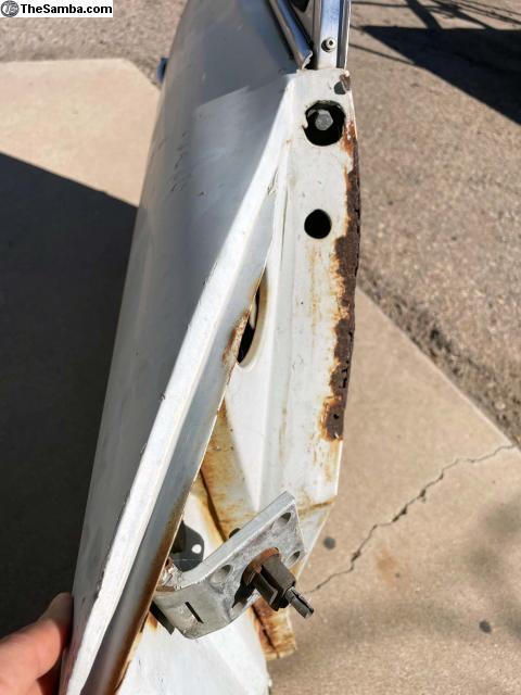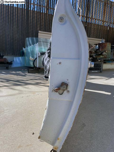 1965 356 C passenger door, complete. Door does not have the inside door cards or other inner trim but is otherwise complete with window and window regulator. Front door jam area will need some rust repair but door is otherwise pretty solid with some surface rust.