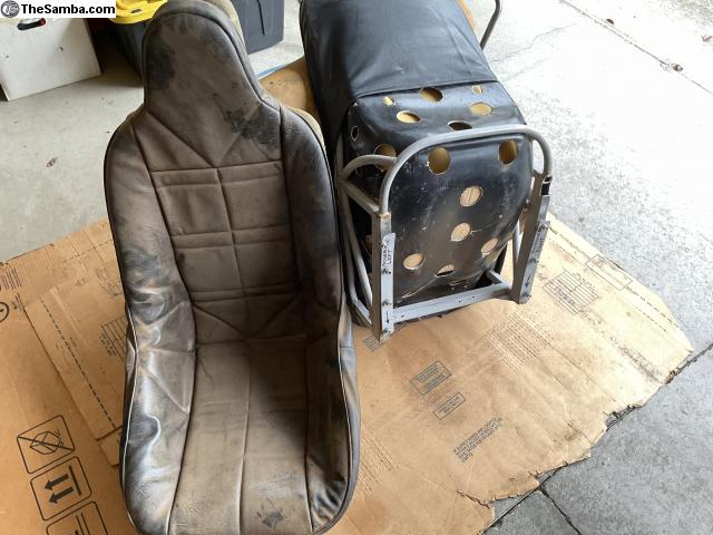 Two fiberglass bucket seats, drivers has belts and seat frame to solid mount
