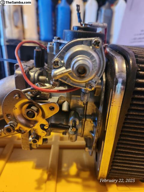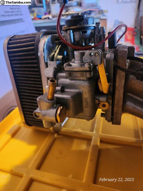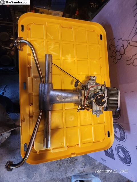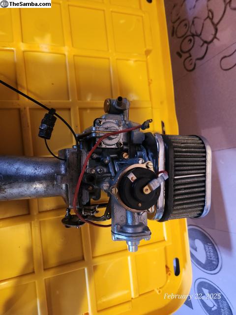 Progressive Carb looks as if it was never used. It comes with the manifold for a dual port set up for a Beetle. The manifold is scuffed in the front.
