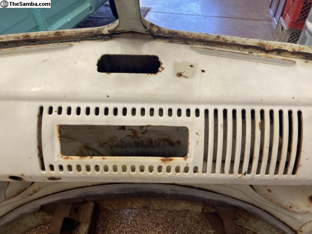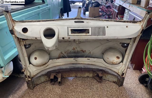 Here is an original front nose clip from a ‘67 Bus that I intended to use as a wall art display. Could be used on non-Barndoor buses, ‘55-‘67, but more correct on ‘65 & later due to headlight buckets, heat pipes, etc.