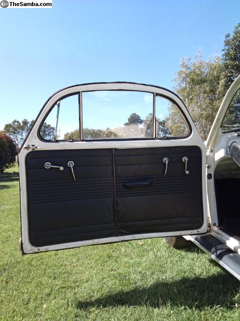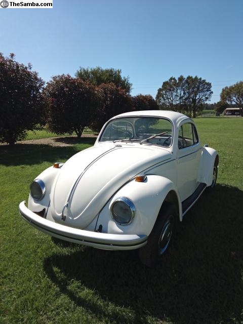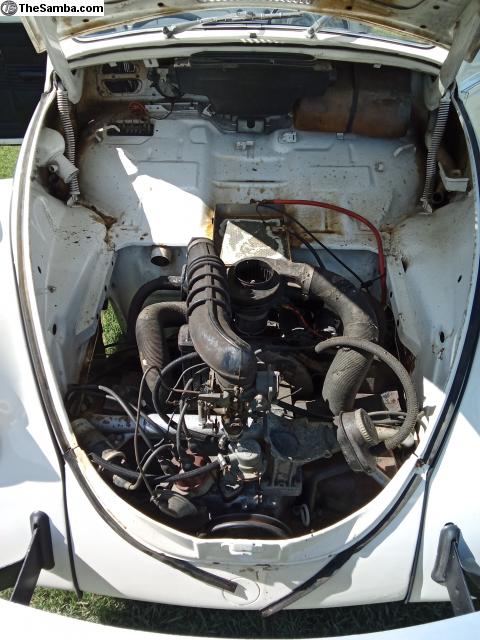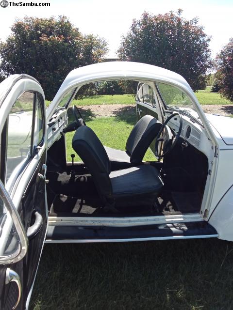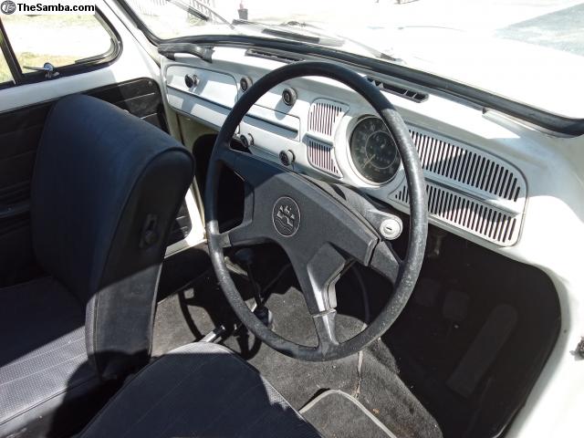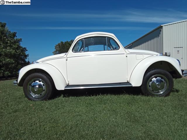 Basically it's a 1500 beetle with pre 67 beetle doors & door glass. 12V, 1500 motor, normal 1500 running gear, disc brakes on front, drums on the rear (which front is the rear?) Michelin XZX 165/15 tyres, chrome dress rings.