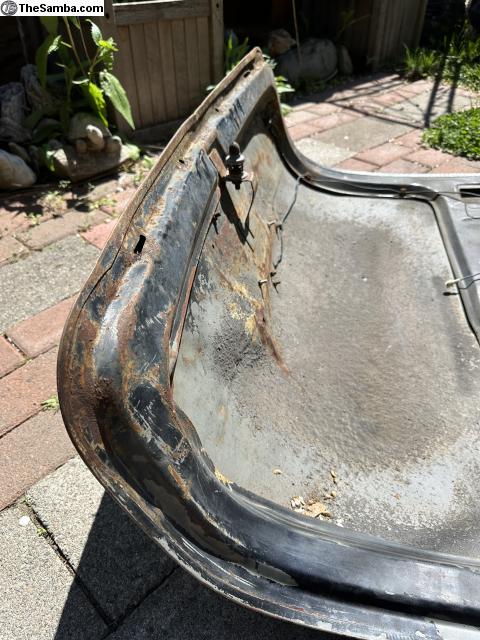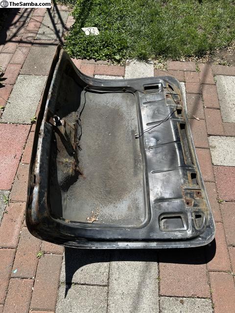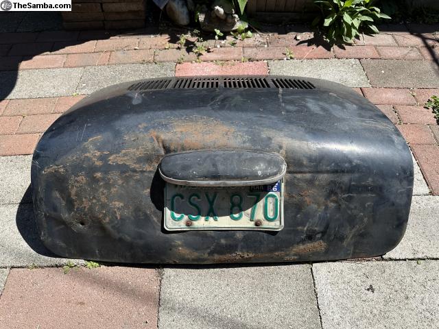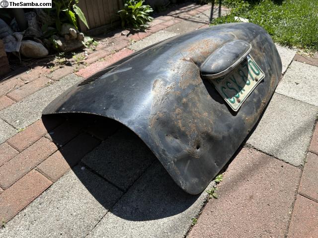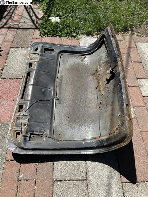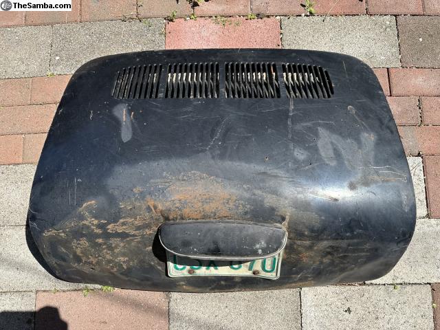 1967 Volkswagen Karmann Ghia engine lid in decent usable condition. Shows a little denting near the license plate area otherwise the shape is pretty fair over all. Great for parting a car back together,parts,repurposing or clean up and use as is. To the best of my knowledge this was removed from a later 60's Ghia