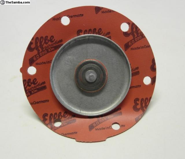 New old stock German 3-ply Effbe fuel pump diaphragm - what came on factory pumps. Correct for 25hp and 36hp fuel pumps. Will disassemble, clean then reassemble adjusting diaphragm preset using factory-spec jig.
