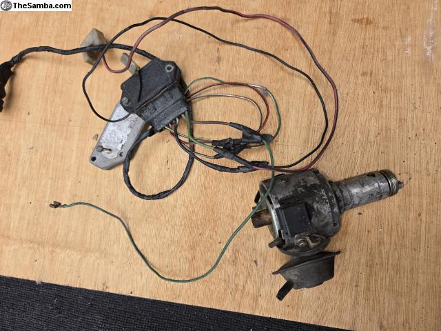 This is a jetta distributor with the shaft filed down to fit an air cooled bug. Yeah - someone actually did that. It worked. All the components of the actual ignition system (even the little tiny pin that you should never drop) are there and will fit the distributor for a 79 bus or Vanagon with the stock electronic ignition distributor. Looks like spaghetti but the wiring is intact but a schematic would be handy. It's as it was since it came out of the car working. Bosch distributor number is 0 237 020 109 .