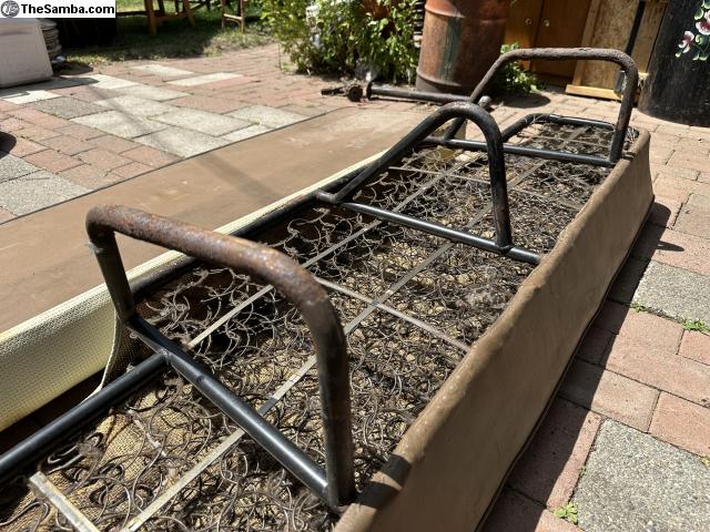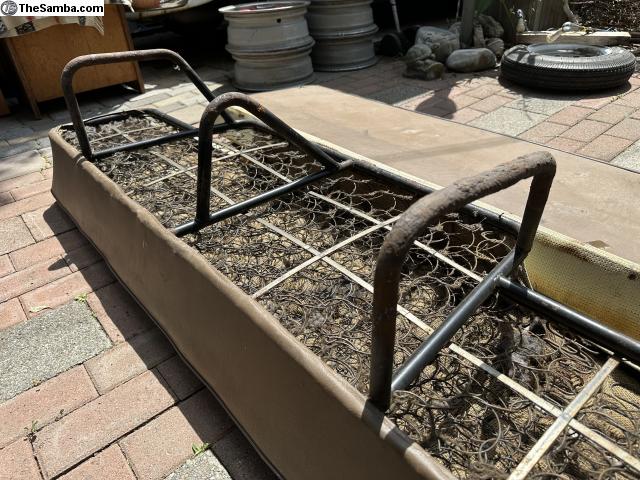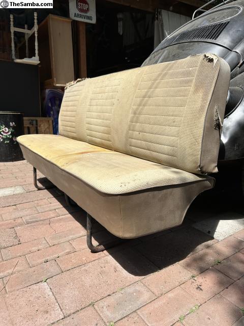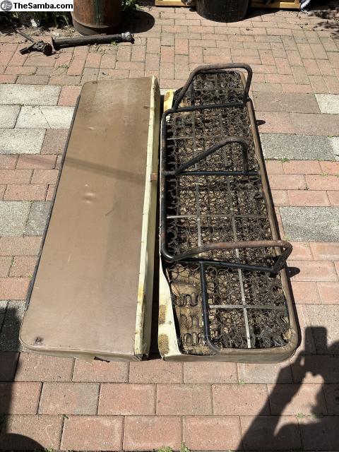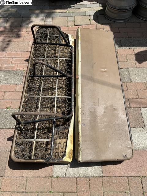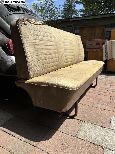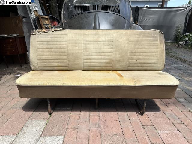 Original 1968 Volkswagen bus rear bench seat in decent usable condition. Original upholstery is a bit weathered but looks usable if need be otherwise looks mostly complete and ready to use. One leg is a little crusty but appears to be very usable. To the best of my knowledge this should be usable in most busses 1958-1974ish. Great for parting a bus back together,restoration or mexi blanket and roll as is