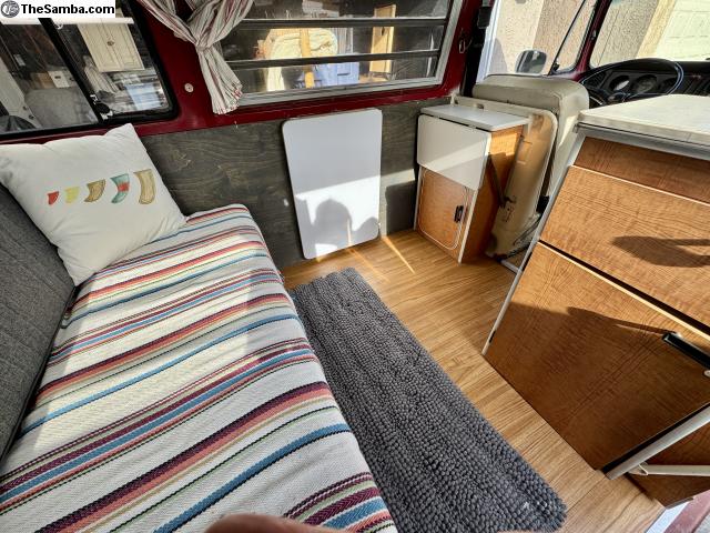 Custom interior with original fridge and sink cabinets, fold out table from top to center of bus.