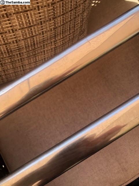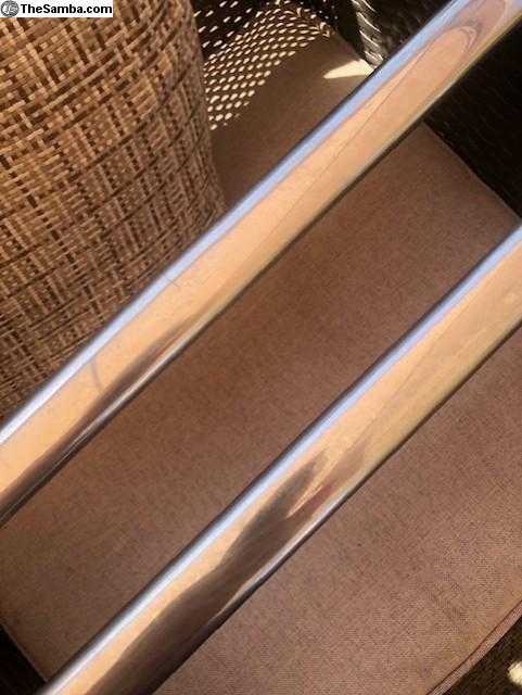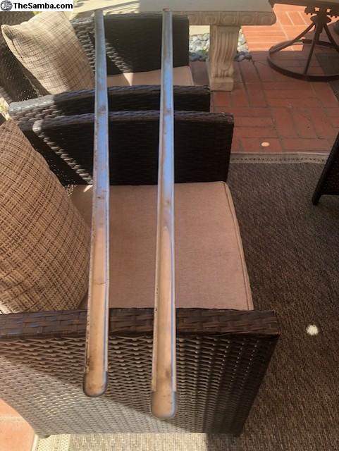 A SET of RUNNING BOARD TRIM removed from a 1956 Bug years ago and stored indoors ever since. Appear to be made of STAINLESS STEEL, definitely not aluminum. They look very nice for being almost 70 years old. Not perfect, but very nice patina. $50.00 for the pair. Sometimes my thesamba emails don't make it to me, so If I don't respond immediately, call me @ 714 406-9067. Thanks for looking.