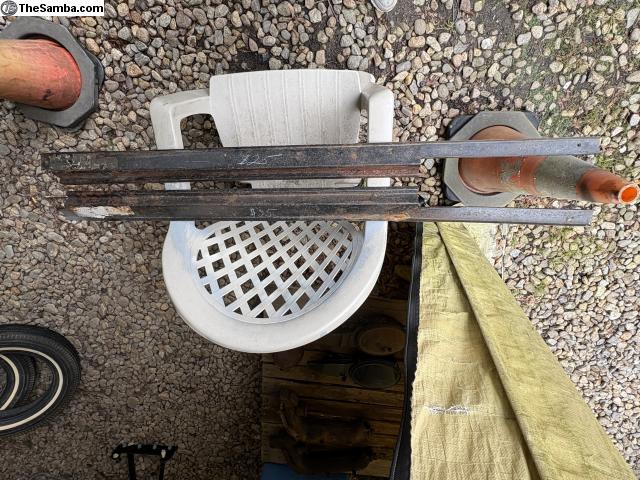 A decent pair of outer heater channel repair panels, which include the running board mounts also. Some surface rust from sitting in my garage.