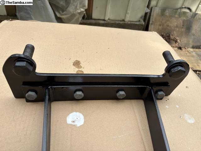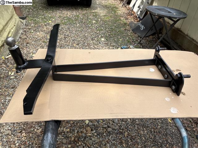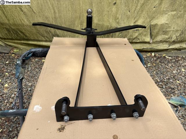 A Super Heavy Duty Trailer Hitch made from 1/4 inch steel. Includes longer bolts for transmission horns. With transmission plate installed, the rest of the hitch Can be removed till needed (with supplied galvanized bolts). Rearward bar sits on top of the bumper brackets, and can be bolted to them for additional stability. This came off a 62 bug, and was used to tow a 900 lb. Trailer/boat, for years with no problems. Includes the 2 inch multi-piece ball. This is NOT one of those cheap hitches I see that only clamp onto frame horns. In 40 years of Wrenching/owning VWs, I've never seen a hitch even come Close to this bad-boy.