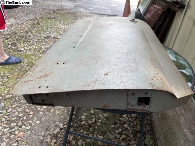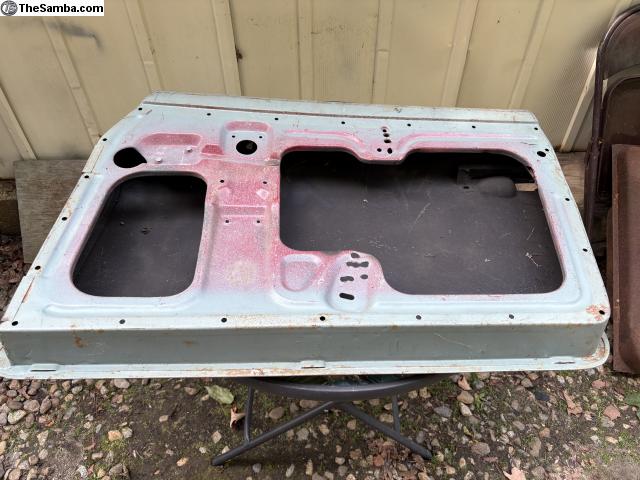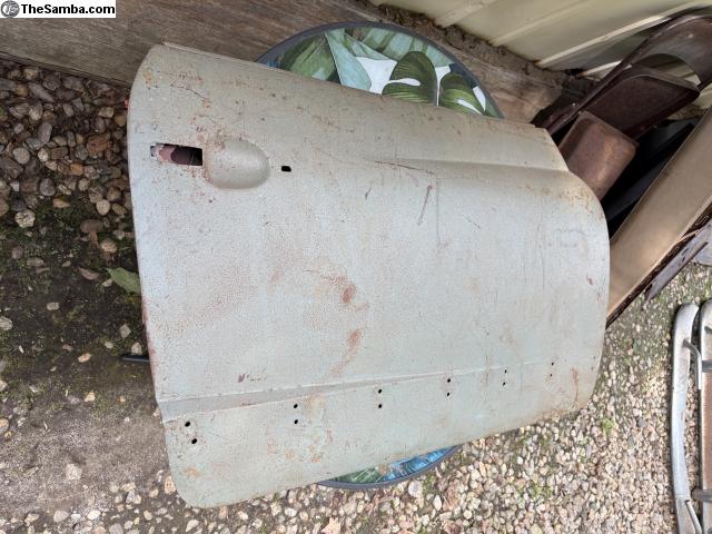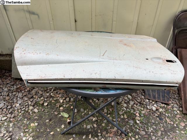 A good used Not rotted passenger side Ghia door. Stripped of paint back to bare metal, then coated with self-etching primer. Interior was coated with bedliner to reduce NVH. Some scratches/surface rust from being in my garage for a few years. Drain holes are all open, as are all the OEM trim mount holes. Ready for you to install on your Ghia !