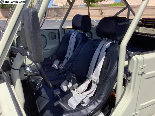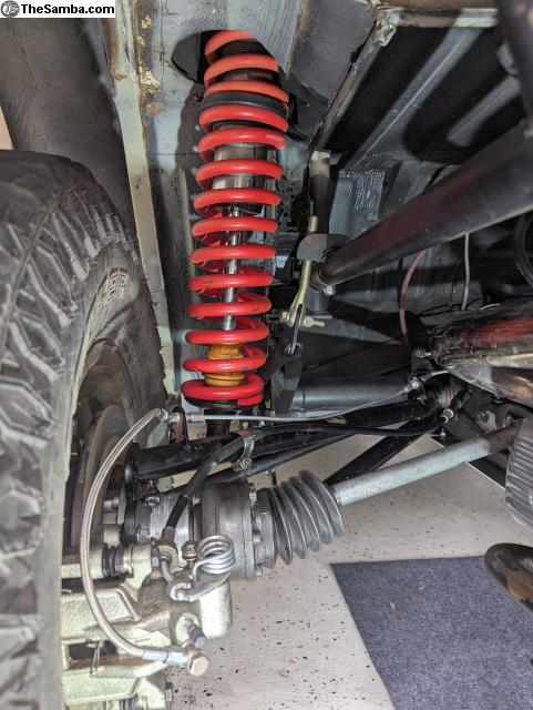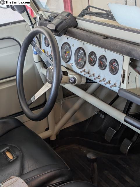 4" taller and wider fiberglass fenders, full roll cage, coilovers with reservoirs on all corners, off road seats with harnesses, 091 buss trans, solid mounts, cromoly 3x3 rear trailing arms, Thing stub axles, EMPI axles and CV joints, EMPI wide 5 disc brakes, cromoly 6" wider front beam with 4" longer trailing arms, EMPI spindles with additional bracing, electric power steering, rack and pinion with 1" tie rods with hiem ends.