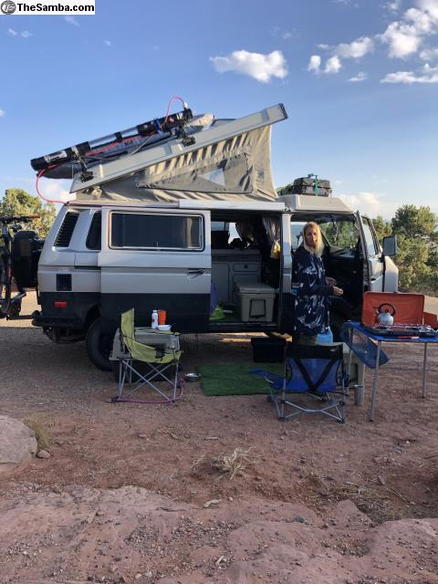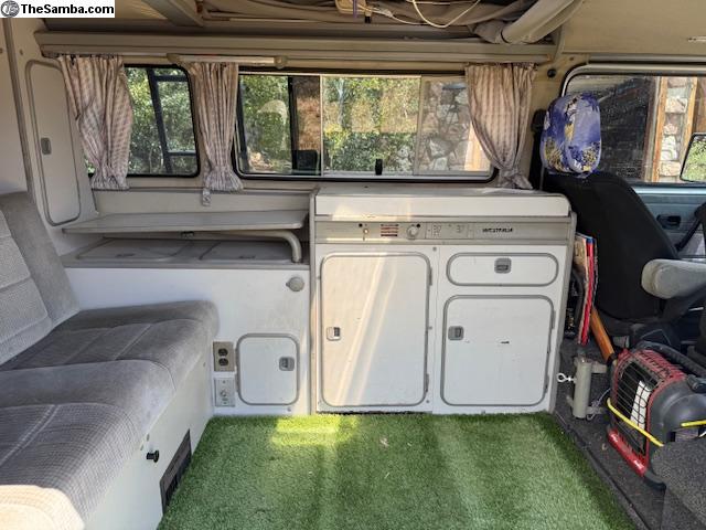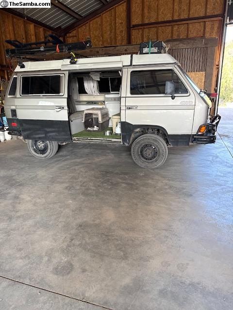 "91 syncro westy, 2.5 Subaru motor manual 5 speed transmission: engine conversion, and front and rear bumpers by Rocky Mountain Westy. New radiator, stainless cooling line, fox shocks 16" wheels good canvas in pop top clean body, paint fading very minor seem "bleeding" in a couple of places. Stove works well. Would be a great platform for a high end restoration or load it up and go camping just the way it is. Driven regularly.