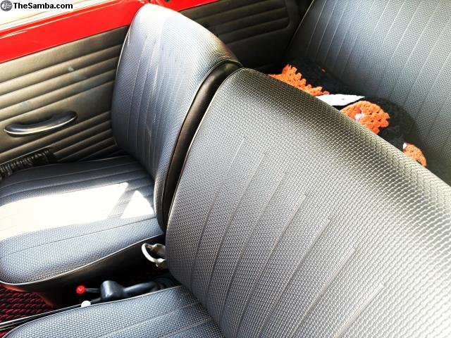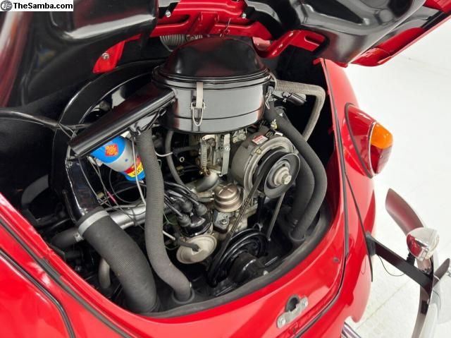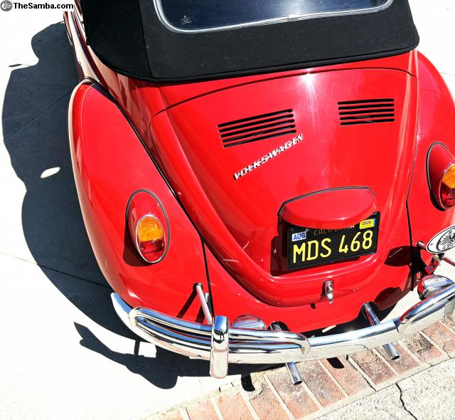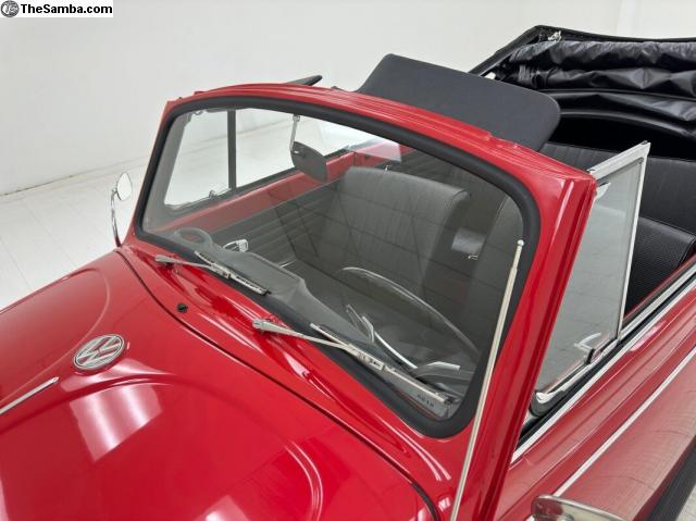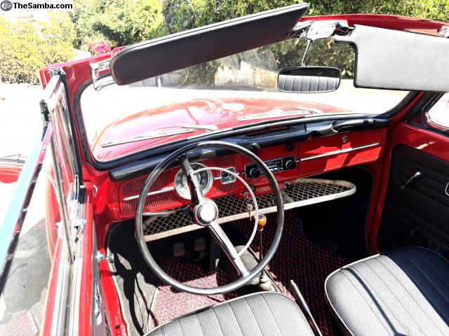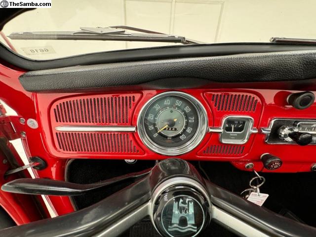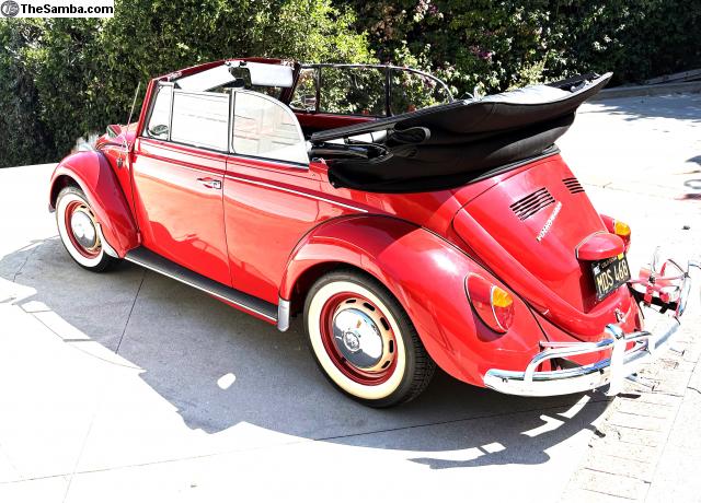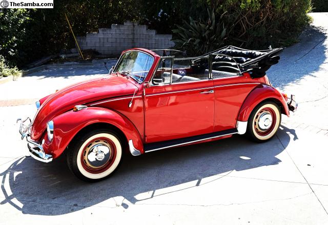 Beautiful fully resotored VW convertible. Red, new radial white walls with matching spare, Disk brakes in front, new correct black 67 convertible seat covers, full floor, doors, rear side panel and firewall sound insulation, Very rare 1960s EMPI dash installed cushion. Original complete Hazet VW tool kit mounted on spare tire.All interior lights-dome, 'door open' lights work. 5 new radial Coker white sidewall tires. German Birth Certificate-all matching numbers including original 1500 engine. New top, original owner manuals, etc.