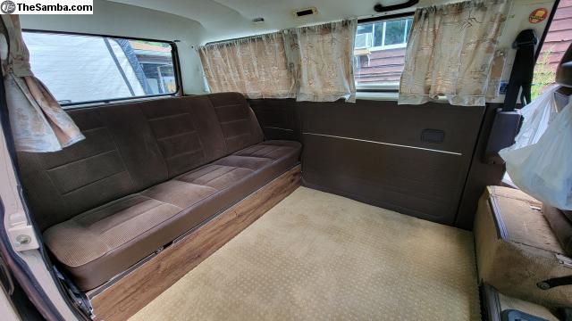 While this van is not a Westfalia, the rear seat folds down into a queen-size bed—perfect for cozy nights under the stars + tons of storage room. Custom made curtains and vinyl plank flooring make the van a cozy home on wheels.