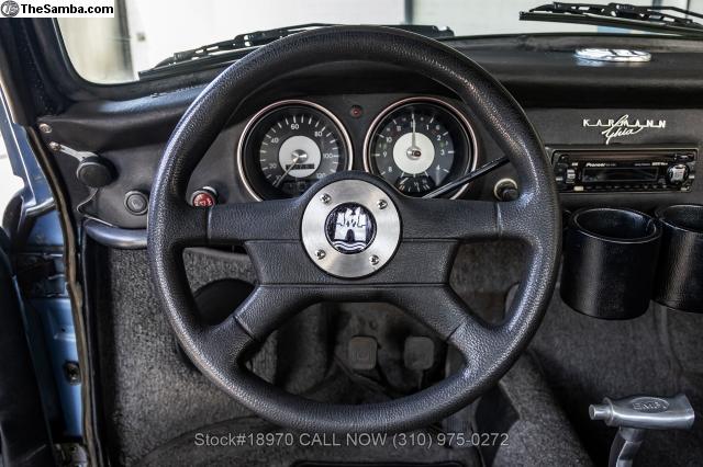 Equipped with a 4-speed manual transmission, air-cooled 1600cc flat-four engine, front-wheel disc brakes, dual exhaust outlets, chrome bumpers with overriders, VDO instrumentation, 4-spoke steering wheel with a horn, and 15-inch steel wheels with Wolfsburg hubcaps. Featured amenities include bucket seating with headrests, dual-side rearview mirrors, glove box, map pockets, roof-luggage mount, Pioneer stereo, and a fender-mounted antenna.