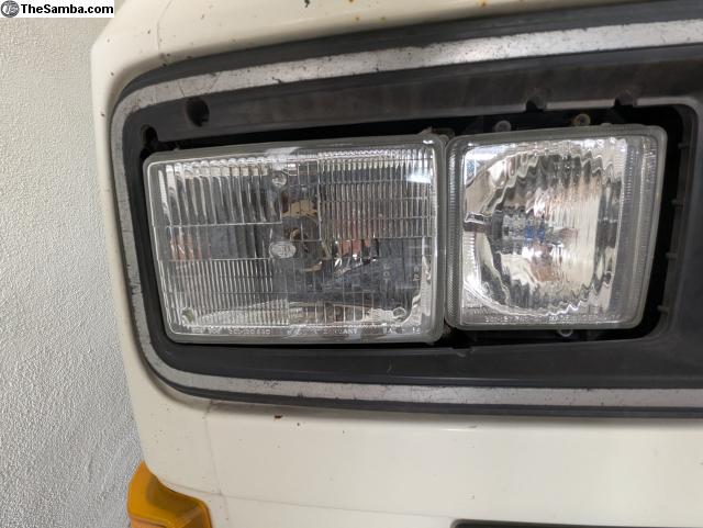 Original grille in good condition. Headlight assemblies were recently cleaned, primed, painted, sealed, new adjusters all around, and new upgraded high power low beam and high beam bulbs. Spare set of high quality Osram brights are included. Pick up only due to it's fragilness. Picture shows them mounted on my van but they've since been removed from vehicle and are ready to go to a new home. Thanks for looking!