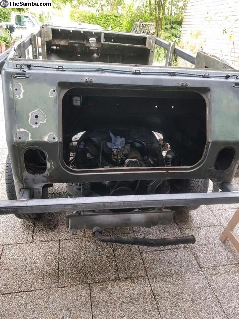 Zur Ausstattung gehört das komplette Interieur, alle Anbauteile(ja, Kotflügel mit seltener kleinen Blinkeraufnahme) und als besondere Highlights sind ein Satz hochwertiger Chrom Mangels Felgen sowie eine originale Bundeswehr-Antenne, sowie eine original getönte Frontscheibe im Lieferumfang enthalten. Da eine Tieferlegung geplant war, sind die originalen Vorder- und Hinterachsen nicht mehr vorhanden. Nach seiner Zeit bei der Bundeswehr fand der Kübel seinen Weg in die Niederlande und verfügt daher über niederländische Papiere. Dies stellt jedoch kein Problem dar, da die Wiederbeschaffung der deutschen Papiere bei der Fertigstellung problemlos möglich ist.