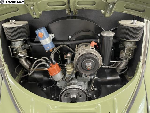 1954 VW Deluxe Beetle, Euro Specification with Semaphores, 7" reflector headlights, fluted Bosch lenses, and single blade bumpers, sold new at Competition Motors in California. Modified with 356 Porsche Speedster torsion bars, spring plates, brake drums, wheels, roller bearing front axles, 356 king and link pins, dampener, and steering box. Adjustable front end, adjustable Konis, and 19mm front sway bar. 165 Michelin XZX radial tires. New Dual circuit master cylinder, all new ATE wheel cylinders, brake lines, and working 356 parking brake cables. Carrera studs on rear drums with 20mm spacers. Dual port engine, twin Kadron carbs, Vintage Speed linkage, stroker, big bore, 009 distributor, Blue Bosch coil, rebuilt Bosch Alternator, Gene Berg timing pulley, custom Sebring exhaust, new wiring harness, new starter, converted to 12Vt. Semaphores are set up with blinking bulbs, Halogen H4 headlights, LED taillights and brake lights. https://www.millersportscars.com/54-beetle