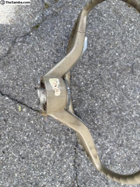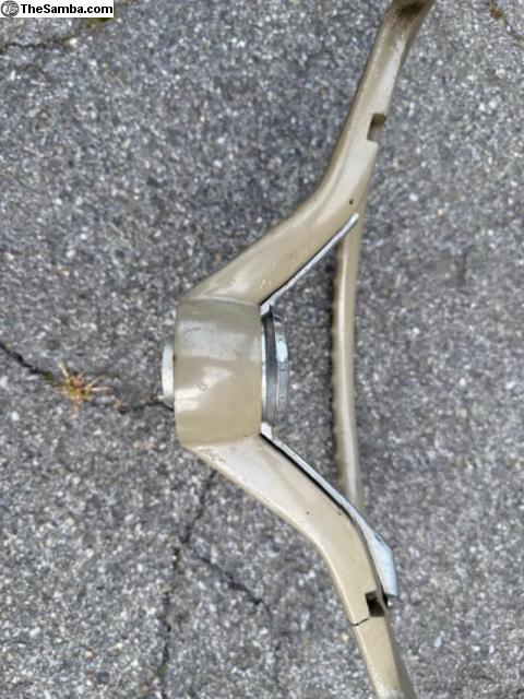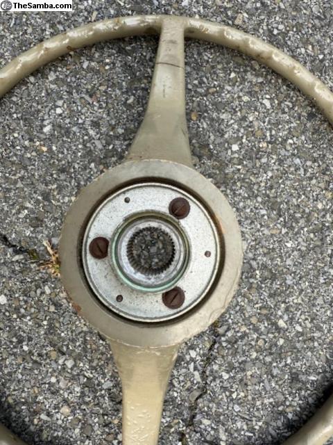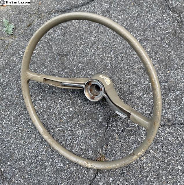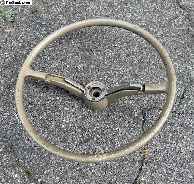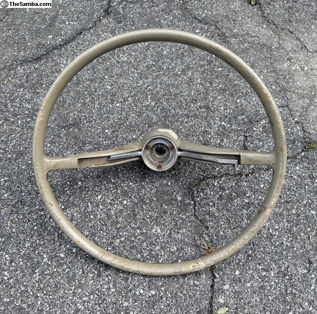 Original Sandstone Steering Wheel. 1960-1961 Only color. In Good condition. Only 1 slight crack (see pics for condition). Can be used as-is or freshen it up. Could use a good cleaning, I'm posting it as it was found.
