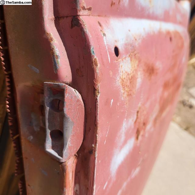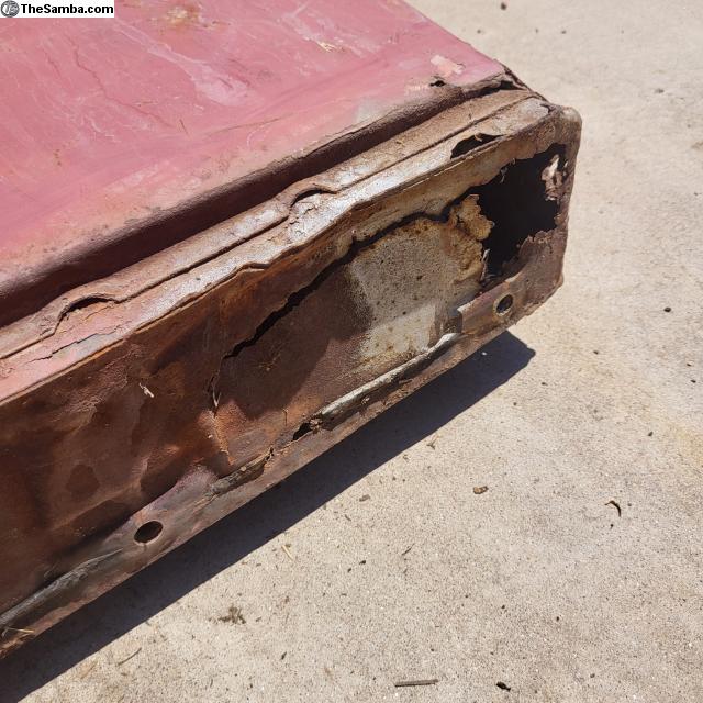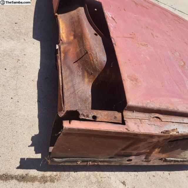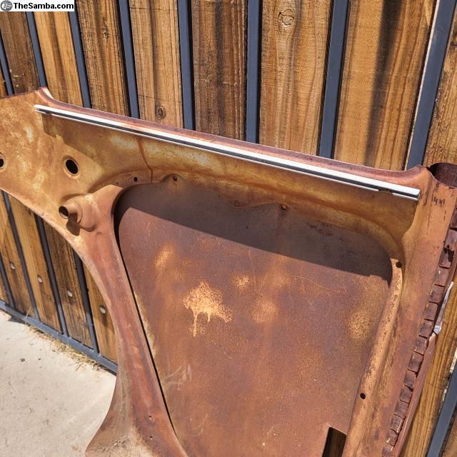 Hello. Here is a left rear quarter panel repair metal section parted from an early oval bug. Cut outs and rust as shown. $25.