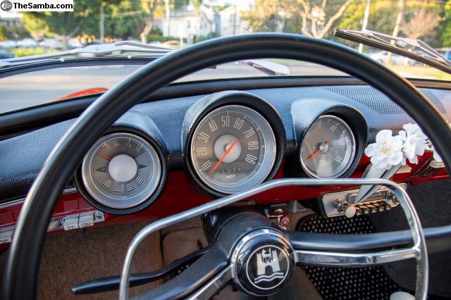 I added a few accessories and safety upgrades such as AC Industries disc brakes up front with a 1966 master cylinder (to keep it looking stock in the frunk), a 6V emergency flasher system, original Jokon reverse lights, an original VDO tachometer, and a rare bud vase holder with vase. NOS VW 1500 x-pattern beauty rings are fitted.