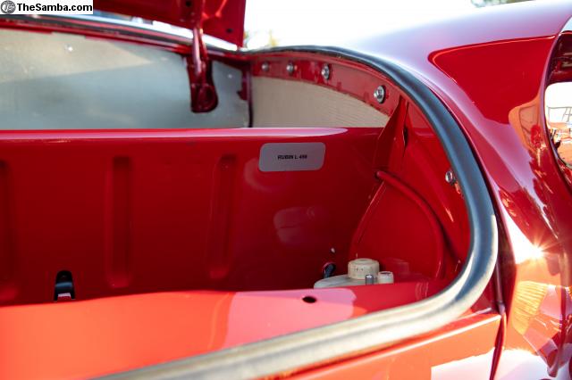The body was stripped to the shell and pan, with major rust repaired before repainting in single-stage Ruby Red L456. Fenders, doors, hood, and trunk were painted inside and out, and the car was assembled with NOS fender beading. The pan halves were repaired and undercoated without separating the body from the pan. The driver's door was replaced with a year-correct piece, while the engine bay retains factory paint. Both trunks still have their original liners. Rust repair was extensive around the rockers, wheel wells, and common areas near the engine compartment. Doors, windows, and pop-outs were rebuilt with new rubber and felts. The front and rear glass received NOS "fat" molding. Bumpers and guards were re-chromed.