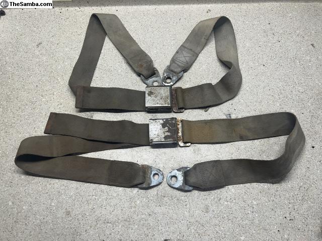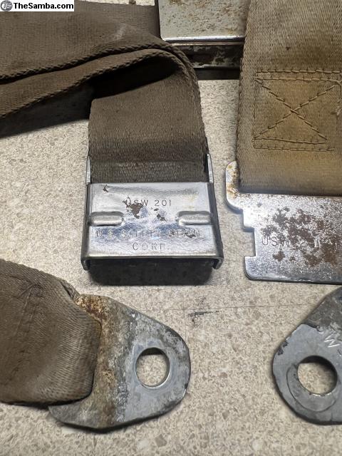 Pair of safety belts removed a while back from Bug I believe. Latches work, chrome is compromised, fabric is Grey color, not been cleaned. Look to be US Safety Weave 201 series. No evidence of sticker to be VWoA supplied tho.