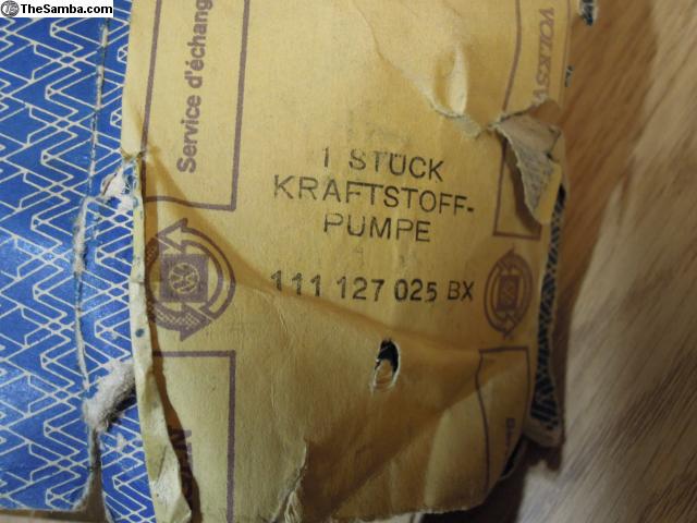 Here is a NOS fuel pump which I bevieve is correct for the oval window beetle. Can be used on a split beetle as well. The part number is 111 127 025 BX, and I think the last X digit means it was factory serviced exchange unit ? Remains of the original box is included.