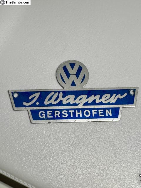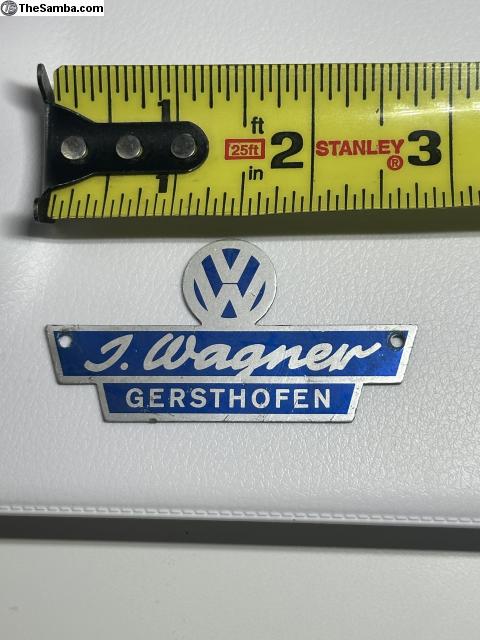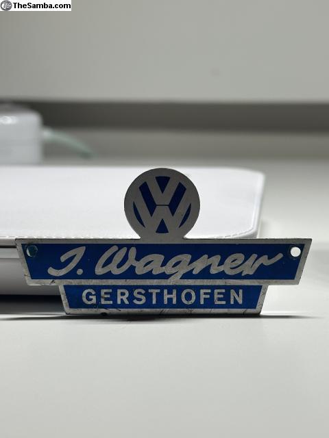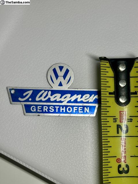 VW J. Wagner - Gersthofen dealership badge. Price includes shipping, tracking in mainland USA. Sold as is. Make sure your address is deliverable. Please add 4% for PayPal