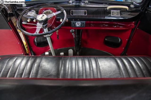 The forward cabin features a bench seat trimmed in black leather with maroon piping. Black carpet was installed throughout the floors, and additional appointments include a overhead ventilation, sliding side windows, and modern sounds system hidden under the front seat with front and rear speakers with subwoofer.